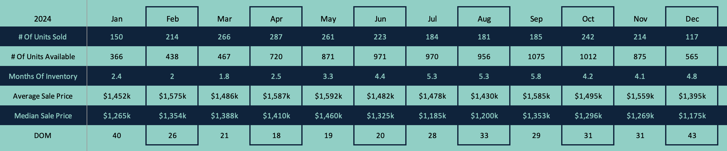 Months of inventory (MOI): this value is an indication of how long it would take to sell all the current inventory if nothing new came to the market.